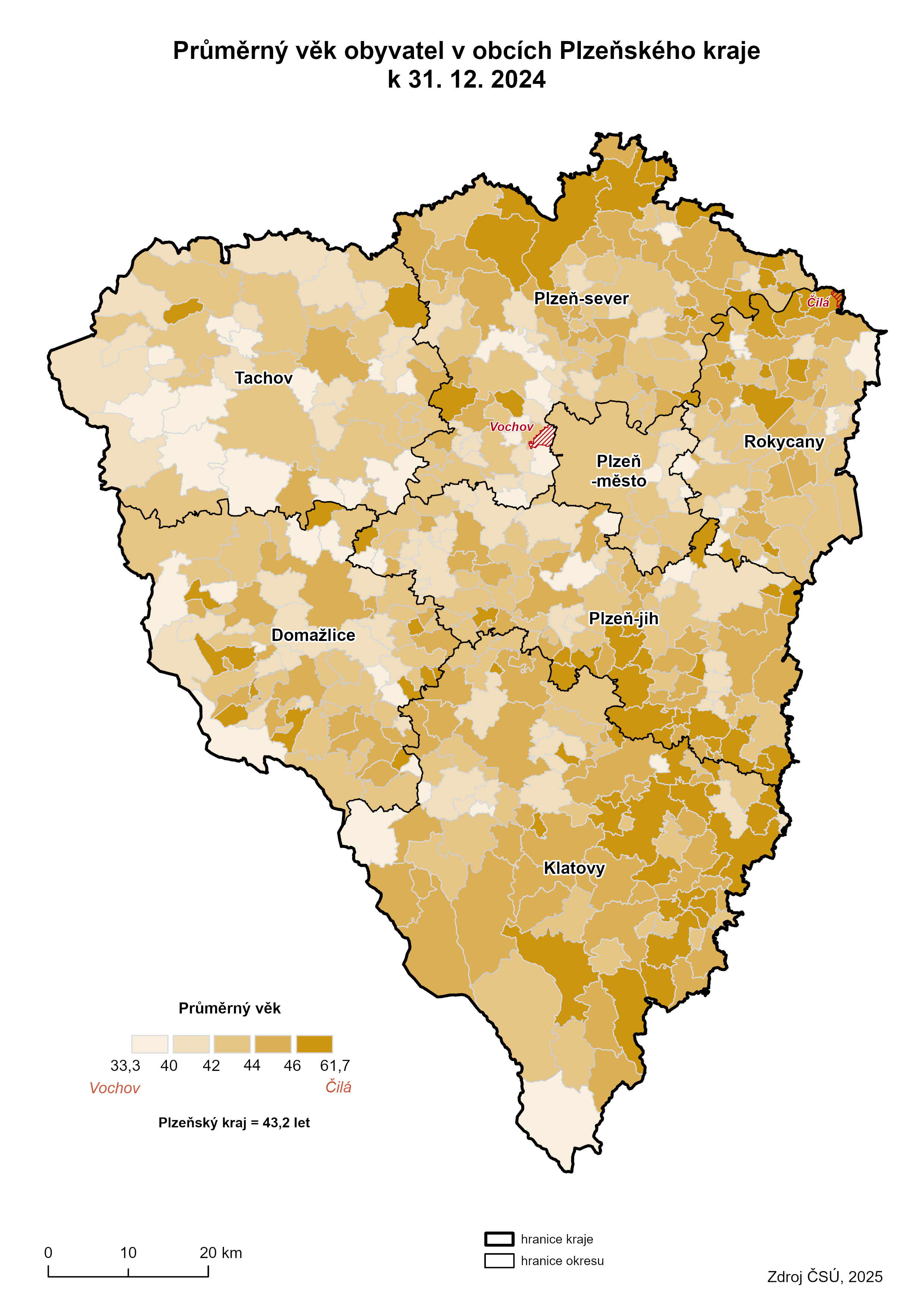 Průměrně nejstarší obyvatelstvo Plzeňského kraje se koncentruje v malých obcích lokalizovaných podél hranic okresů zejména na Rokycansku, Klatovsku a severním Plzeňsku. Naopak mladší produktivní populace kraje zakládá rodiny v obcích s dobrou dopravní dostupností v zázemí krajského města. Typickým příkladem je obec Vochov, kde byl zaznamenán nejen nejnižší průměrný věk a index stáří, ale zároveň relativně nejvyšší celkový přírůstek obyvatel.