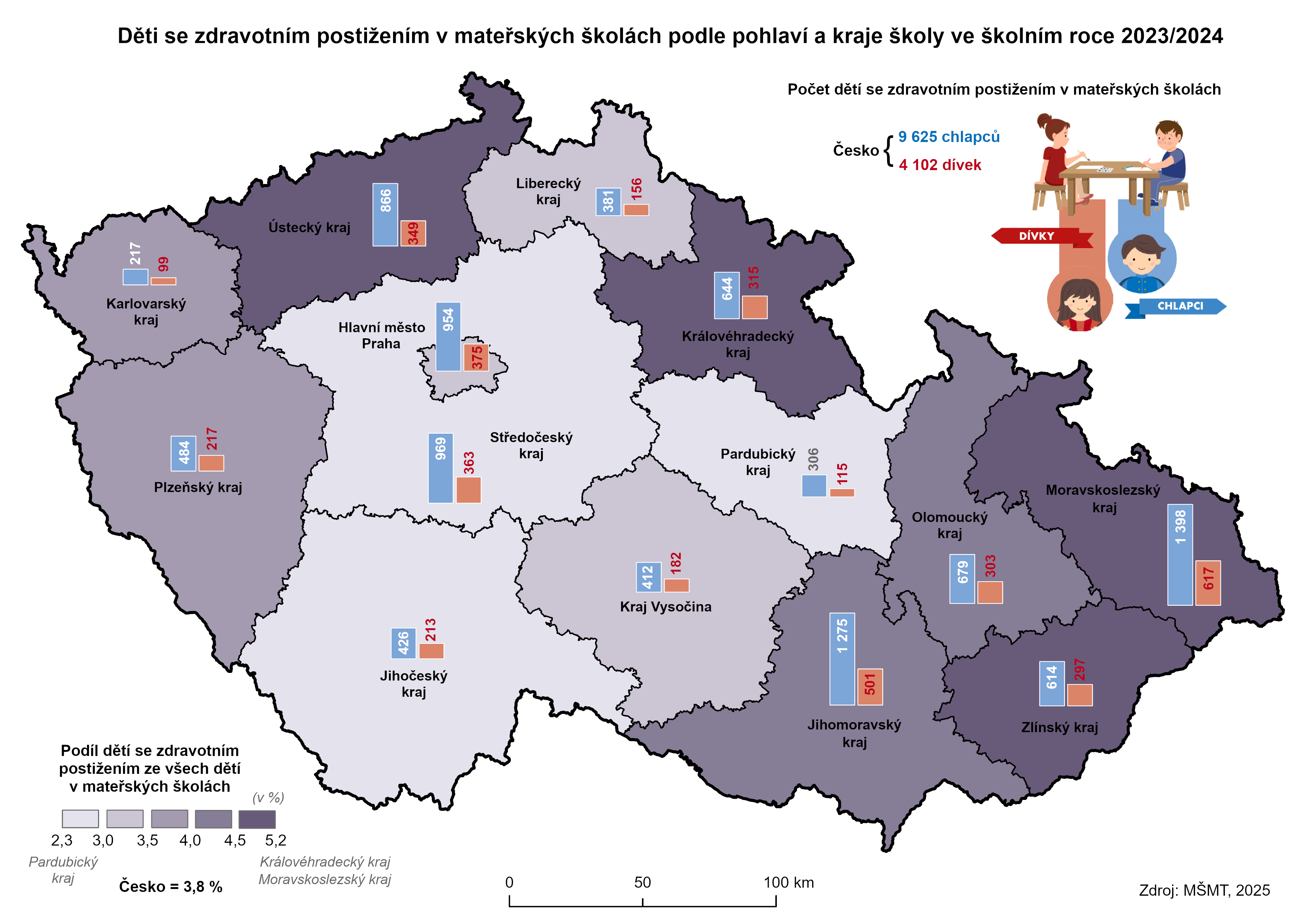 I zde platí, že se ve většině případů jednalo o chlapce, a to v rámci našeho kraje v téměř 70 %. Z hlediska vážnosti šlo u více než poloviny dětí o závažná zdravotní postižení, střední závažnost byla evidována u 45,1 % z nich. Z republikových průměrů vyplývá, že mezi nejčastější typy postižení v Česku patřily ve školním roce 2023/2024 závažné vady řeči, které se prokázaly ve více než polovině případů, tj. u 6 889 dětí se zdravotním postižením v mateřských školách. Často se také vyskytovaly případy, kdy bylo u dětí zaznamenáno více vad najednou (12,1 %), poruchy autistického spektra (11,6 %) nebo závažné vývojové poruchy chování (8,0 %). Obecně je možné v rámci vývoje v Česku sledovat nárůst počtu dětí, které v rámci vzdělávacích institucí vyžadují speciální přístup, přičemž při interpretaci je potřeba brát mimo jiné v potaz možný vliv legislativních, metodických a jiných změn, které mohou pozorovaný trend zkreslovat.