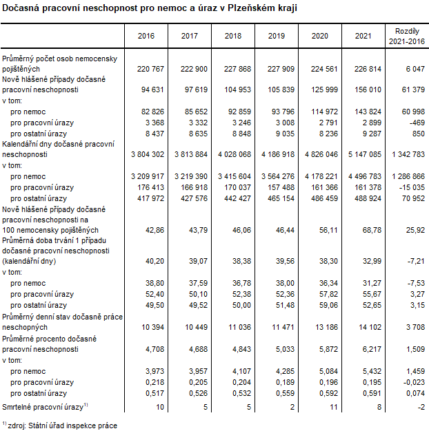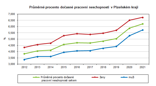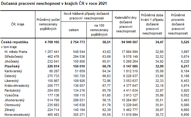 Dočasná pracovní neschopnost v Plzeňském kraji v porovnání s minulým obdobím v důsledku pandemie covid-19 výrazně vzrostla. V počtu nově hlášených případů dočasné pracovní neschopnosti na 100 pojištěnců se Plzeňský kraj v porovnání s ostatními kraji umístil na druhém místě. Oproti roku 2021 se snížila průměrná doba trvání 1 případu dočasné pracovní neschopnosti. Průměrné procento dočasné pracovní neschopnosti bylo v období let 2016–2021 nejvyšší v roce 2021. Na zvýšeném průměrném procentu dočasné pracovní neschopnosti se především podílelo průměrné procento dočasné pracovní neschopnosti pro nemoc.