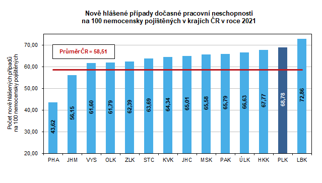 Počet nově hlášených případů dočasné pracovní neschopnosti na 100 nemocensky pojištěných dosáhl v roce 2021 v Plzeňském kraji hodnoty 68,78 a v rámci krajů byl druhý nejvyšší. Nejnižší hodnoty byly v tomto ukazateli zaznamenány v Hl. městě Praze (43,62) a v Jihomoravském kraji (56,15), naopak nejvyšší počet nově hlášených případů (72,86) měl Liberecký kraj. Oproti průměru ČR (58,51) byl počet nově hlášených případů dočasné pracovní neschopnosti na 100 nemocensky pojištěných v Plzeňském kraji vyšší o 10,27 případů. Hodnota tohoto ukazatele vzrostla meziročně ve všech krajích, ve 12 ze 14 krajů se pohybovala nad republikovým průměrem. Nejvyšší meziroční nárůst (o 22,6 %) byl zaznamenán v Plzeňském kraji, nejnižší ve Zlínském kraji (o 5,4 %). Počet nově hlášených případů dočasné pracovní neschopnosti na 100 nemocensky pojištěných se v Plzeňském kraji zvýšil z 56,11 případů v roce 2020 na 68,78 případů v roce 2021. Na růstu počtu nově hlášených případů se zejména podílela pandemie covid-19. Výrazně vyšší počet nově hlášených případů v průběhu let 2019–2021 byl ovlivněn zrušením karenční doby od 1. 7. 2019, kdy zaměstnanci začali dostávat náhradu mzdy i za první tři dny nemoci.