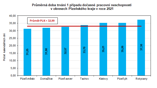 Průměrná doba trvání 1 případu dočasné pracovní neschopnosti v kalendářních dnech byla v roce 2021 nejvyšší v okresech Rokycany (37,30) a Plzeň-jih (35,26), naopak nejnižší byla v okrese Plzeň-město (31,25). V porovnání s okresem Plzeň-město byla na Rokycansku průměrná doba trvání 1 případu delší o 6,06 kalendářního dne.