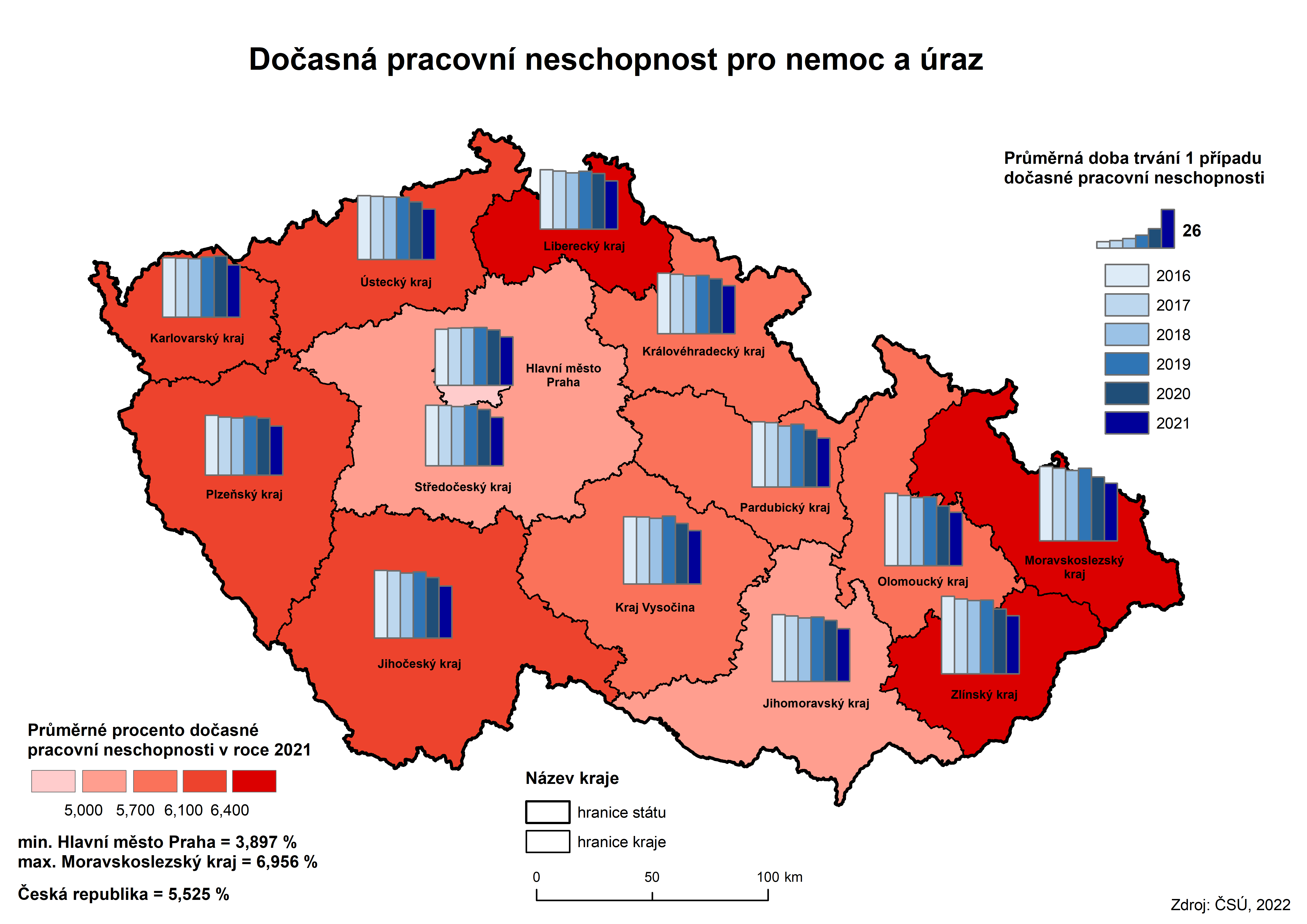 V období let 2016–2021 se zvýšil počet nově hlášených případů dočasné pracovní neschopnosti na 100 nemocensky pojištěných ze 42,86 případů v roce 2016 na 68,78 případů v roce 2021, tj. zvýšení o 25,92 případů. Průměrná doba trvání 1 případu dočasné pracovní neschopnosti se ve sledované časové řadě zkrátila o 7,21 kalendářního dne. Průměrné procento dočasné pracovní neschopnosti vzrostlo v roce 2021 v porovnání s rokem 2016 o 1,509 p. b. Průměrný denní stav práce neschopných se zvýšil z 10 394 případů v roce 2016 na 14 102 případů v roce 2021, tj. zvýšení o 35,7 %.