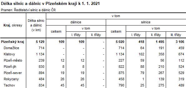 Silniční síť zahrnující silnice bez dálnic dosáhla k 1. 1. 2021 na území ČR celkové délky 54 493 km, na území Plzeňského kraje činila 5 020 km, z toho 8,3 % připadlo na silnice I. třídy, 29,8 % na silnice II. třídy a zbývajících 61,9 % na silnice III. třídy. Také u délky silnic nedošlo v posledních deseti letech v Plzeňském kraji k žádným změnám. Nejdelší silniční sítí disponuje okres Klatovy, kde délka silnic k 1. 1. 2021 činila 1 134 km a tohoto prvenství bylo dosaženo díky silnicím III. třídy, které se na celkové délce v tomto okrese podílely 59,4 %. V dalších šesti plzeňských okresech již délka silnic nepřesáhla hodnotu 1 000 km. Druhým okresem s nejhustší silniční sítí byl okres Plzeň-sever (875 km) a třetím okres Tachov (790 km).