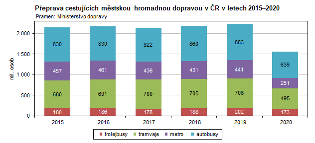 V České republice byla v roce 2020 přeprava cestujících autobusy (41,0 %) nejčastěji zvolenou formou přepravy v rámci městské hromadné dopravy. Druhým nejfrekventovanějším dopravním prostředkem byla tramvaj (31,8 %), třetím metro (16,1 %) a na posledním místě se umístilo cestování trolejbusy (11,1 %).