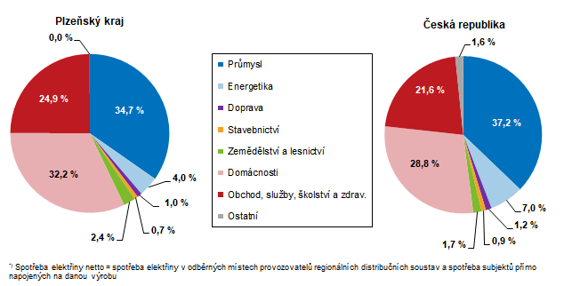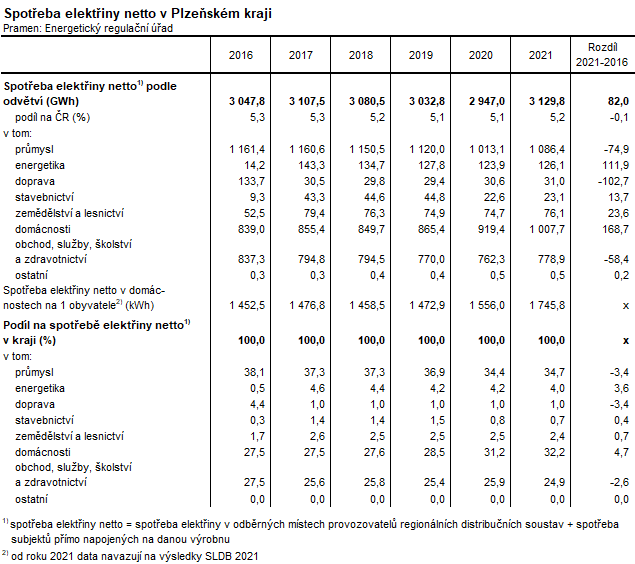 Spotřeba elektřiny netto v domácnostech na 1 obyvatele v roce 2021 v Plzeňském kraji činila 1 745,8 kWh. Tento ukazatel nelze srovnávat s přechozími lety, protože počet obyvatel v roce 2021 navazuje na výsledky SLDB 2021. Ve spotřebě elektřiny v domácnostech na 1 obyvatele se v mezikrajském porovnání umístil Plzeňský kraj na pátém místě. V rámci všech krajů dosáhl v tomto ukazateli nejvyšší spotřeby kraj Středočeský (2 341,8 kWh) a naopak nejnižší spotřeby Hl. město Praha (1 230,7 kWh). V porovnání s průměrem ČR (1 643,7 kWh) byla spotřeba elektřiny v domácnostech na 1 obyvatele v Plzeňském kraji vyšší o 102,1 kWh.