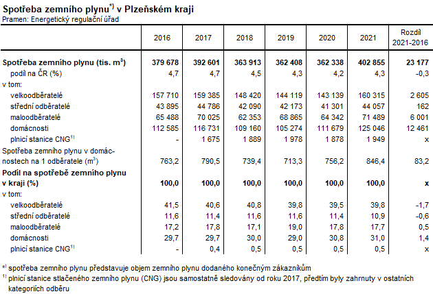V roce 2021 se spotřebovalo v Plzeňském kraji 402,9 mil. m3 zemního plynu, meziročně se jeho spotřeba zvýšila o 40,5 mil. m3, tj. zvýšení o 11,2 %.