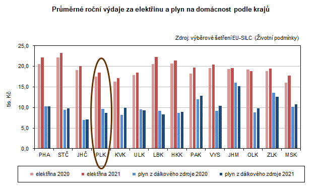 Průměrné roční výdaje na 1 domácnost byly zjišťovány na základě výběrového šetření EU–SILC o příjmech a životních podmínkách domácností pod názvem Životní podmínky 2017. Při interpretaci těchto výsledků šetření je třeba mít neustále na paměti, že jsou zatíženy statistickou chybou. V Plzeňském kraji činila v roce 2021 výše průměrných ročních výdajů na 1 domácnost za elektřinu 18,5 tis. Kč a za plyn z dálkového zdroje 8,7 tis. Kč. Meziročně v Plzeňském kraji vzrostly průměrné roční výdaje za elektřinu o 5,5 %, naopak roční výdaje za plyn z dálkového zdroje klesly v průměru o 9,9 %. V roce 2021 dosáhly v ČR průměrné roční výdaje na 1 domácnost za elektřinu 20,2 tis. Kč a za plyn z dálkového zdroje 10,5 tis. Kč. Nejvyšší průměrné roční výdaje na 1 domácnost (23,3 tis. Kč) za elektřinu zaplatili obyvatelé ve Středočeském kraji, naopak nejnižší průměrné roční výdaje (17,1 tis. Kč) byly zaznamenány v Karlovarském kraji. Nejvyšší průměrné roční výdaje na 1 domácnost (15,2 tis. Kč) za plyn z dálkového zdroje zaplatili v Jihomoravském kraji, naopak nejnižší průměrné roční výdaje (7,1 tis. Kč) připadly na 1 domácnost v Jihočeském kraji.