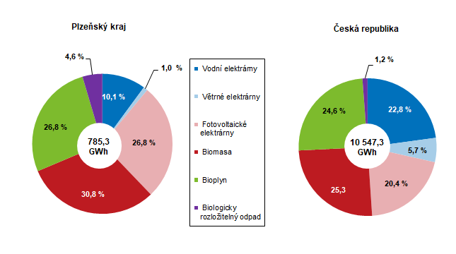 V roce 2021 se v Plzeňském kraji vyrobilo 785,3 GWh elektřiny z obnovitelných zdrojů energie, podíl na celkové vyrobené elektřině v kraji dosáhl výše 55,0 %. V ČR činil podíl elektřiny vyrobené z obnovitelných zdrojů energie na vyrobené elektřině celkem 12,4 %. V Plzeňském kraji se na výrobě elektřiny z obnovitelných zdrojů podílela nejvíce biomasa (30,8 %). Druhé místo obsadila výroba elektrické energie, která byla získána ve fotovoltaických elektrárnách (26,8 %) a spalováním bioplynu (26,8 %). V mezikrajském porovnání se Plzeňský kraj ve výrobě elektřiny z obnovitelných zdrojů energie umístil na pátém místě. V České republice se nejvíce podílely na výrobě elektřiny z obnovitelných zdrojů energie biomasa (25,3 %) a bioplyn (24,6 %). Nejvyšší množství výroby elektřiny z obnovitelných zdrojů bylo dosaženo v krajích Středočeském (2 061,8 GWh), Ústeckém (1 507,8 GWh) a Jihomoravském (1193,1 GWh).