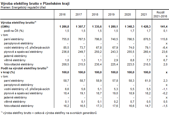 V Plzeňském kraji bylo v roce 2021 vyrobeno 1 428,3 GWh elektřiny brutto. Meziročně se zvýšila výroba elektřiny o 5,9 %, ke zvýšení výroby došlo ve všech typech elektráren kromě větrných a fotovoltaických. Nejvyšší meziroční nárůst (84,0 GWh) byl zaznamenán v parních elektrárnách, tj. zvýšení o 10,7 %. Výroba elektřiny v Plzeňském kraji tvořila 1,7 % z celkové výroby elektřiny v ČR a v mezikrajském srovnání se Plzeňský kraj zařadil na desáté místo. Na výrobě elektřiny se v ČR nejvíce podílely kraje Ústecký (27,6 %), Jihočeský (20,1 %) a Vysočina (19,0 %) V období let 2016–2021 bylo v Plzeňském kraji vyrobeno nejvíce elektrické energie v roce 2021, kdy výroba elektrické energie celkem činila 1 428,3 GWh, naopak nejnižší výroba elektrické energie (1 280,1 GWh) byla zaznamenána v roce 2019. V roce 2021 byla výroba elektřiny v porovnání s rokem 2019 vyšší o 11,6 %.