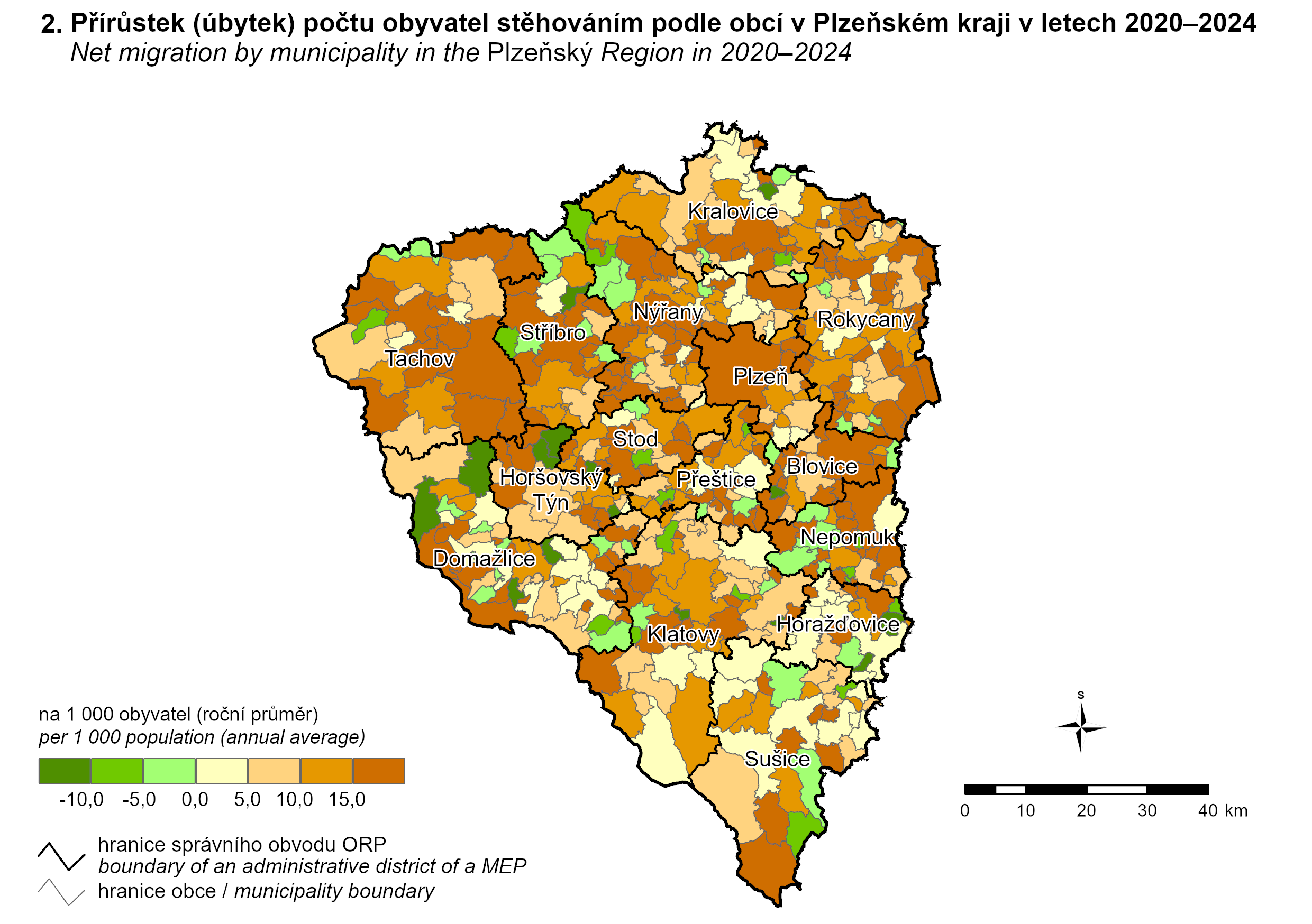 Přírůstek (úbytek) počtu obyvatel stěhováním podle obcí v Plzeňském kraji