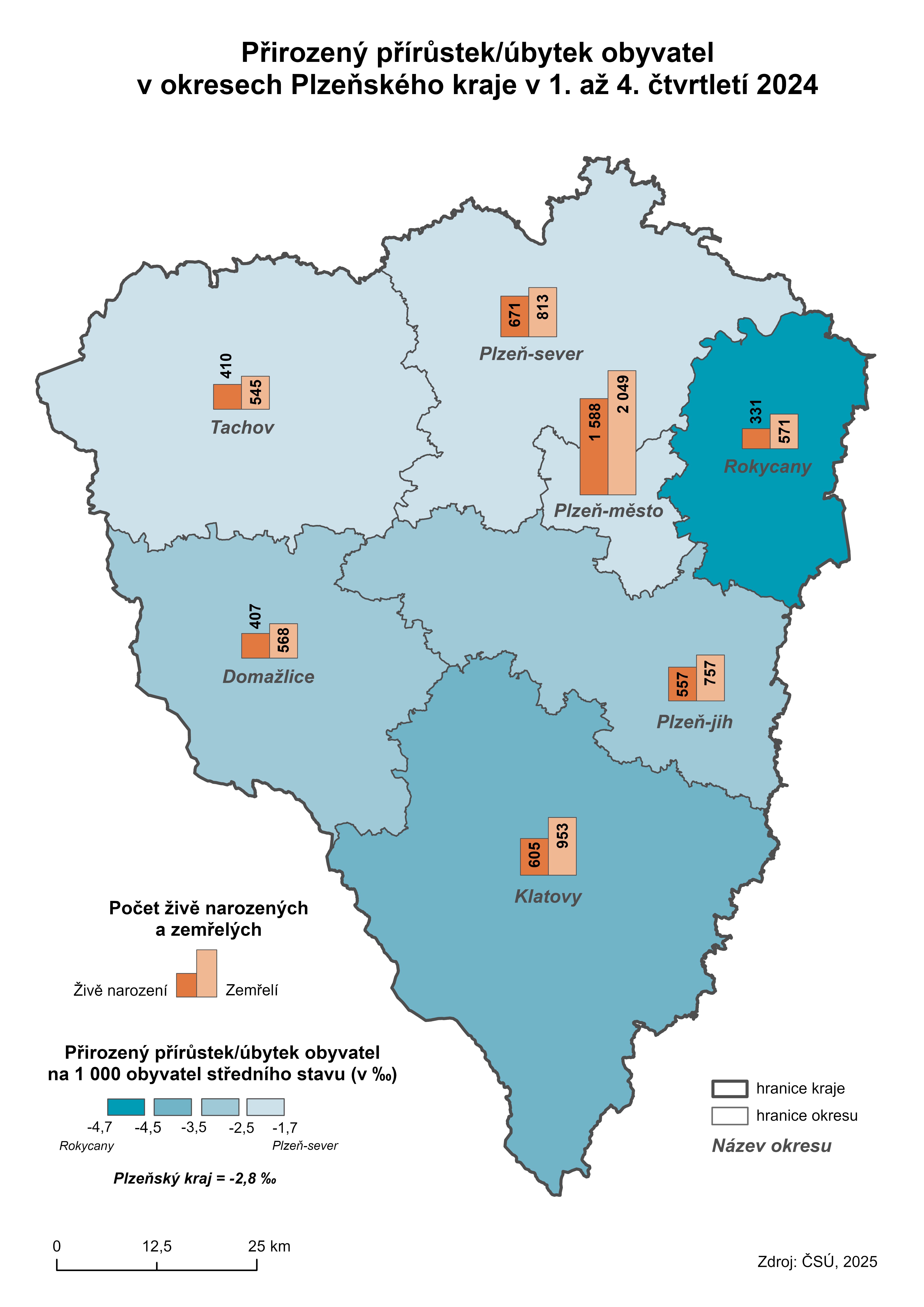 Přirozený přírůstek/úbytek obyvatel v okresech Plzeňského kraje