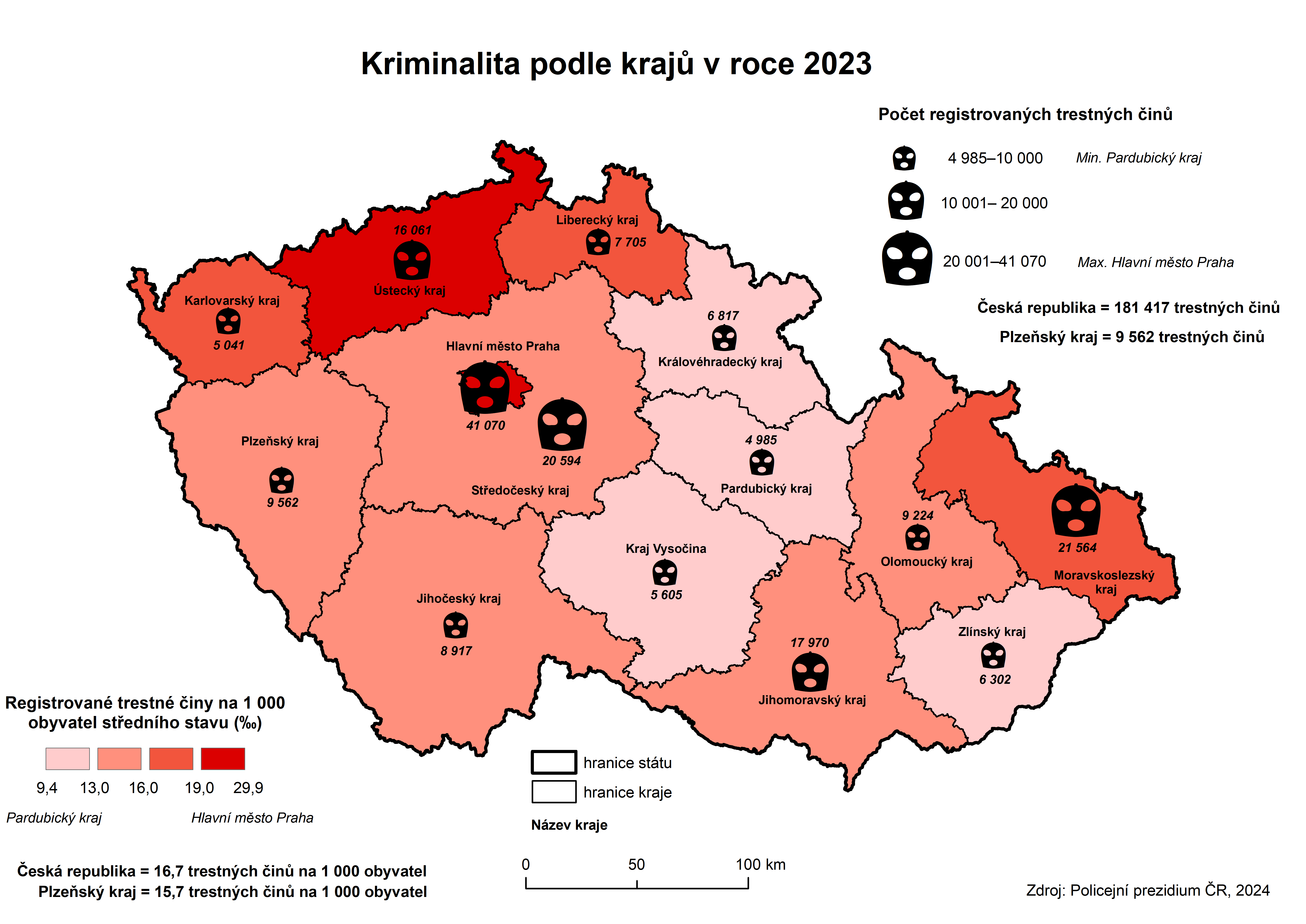Trestná činnost v přepočtu na tisíc obyvatel středního stavu byla v roce 2023 nejvýraznější v Praze, Ústeckém a Moravskoslezském kraji, naopak nejlépe na tom byly kraje Pardubický, Vysočina a Zlínský. Plzeňský region se zařadil s 15,7 registrovanými trestnými činy na tisíc obyvatel na šestou pozici mezi kraji.