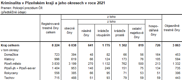 Nejvíce trestných činů se podařilo objasnit policejním orgánům v okrese Domažlice (62,7 %), nejméně potom v okrese Plzeň-město (34,8 %). Ve srovnání s rokem 2020 byl v regionu zaznamenán v roce 2021 nárůst procenta objasněnosti trestních činů ve všech jeho okresech, nejvíce v okrese Rokycany, a to o 7,9 procentních bodů. Celkově došlo v Plzeňském kraji oproti roku 2020 ke zvýšení procenta objasněnosti trestných činů o 2,5 procentního bodu.