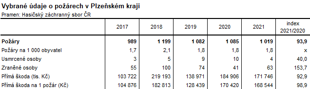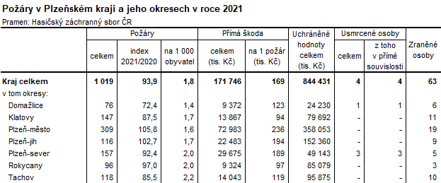 Zdrojem údajů o požárech a zásahů hasičských záchranných sborů pro ČSÚ jsou data zpracovaná hasičskými záchrannými sbory. V roce 2021 došlo ke vzniku 1 019 požárů, což znamenalo meziroční pokles o 6,1 %. Nemalý podíl na vyšším počtu vzniklých požárů měl zajisté vliv dlouhotrvajícího sucha a vyšších teplot v průběhu letních měsíců v posledních několika letech. Ve sledovaném období 2011 až 2021 vzniklo nejvíce požárů v roce 2015 (1 244). Mezi kraji se Plzeňský region zařadil na třetí místo s nejvyšším počtem požárů v přepočtu na 1 000 obyvatel (1,8 požárů na 1 tis. obyvatel). Plzeňský kraj se na celkovém počtu požárů v ČR podílel 6,3 %.