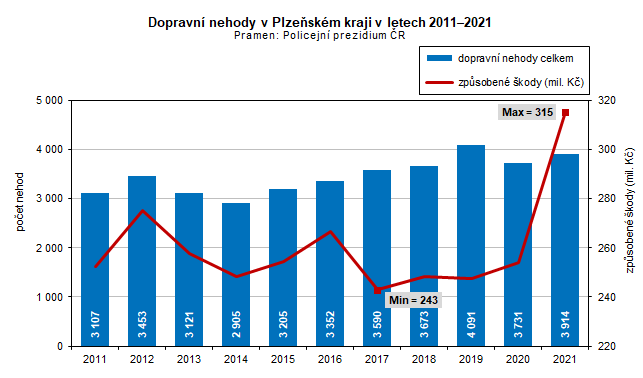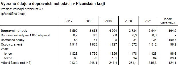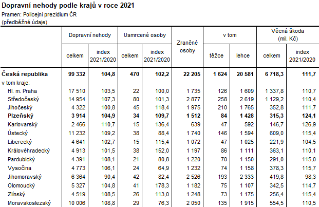 Při dopravních nehodách bylo v roce 2021 usmrceno 34 osob, o 3 osoby více než v předchozím roce, osob s těžkým zraněním bylo 84. U nehod s lehkým zraněním v meziročním srovnání byl zaznamenán pokles o 3,4 % (o 50 osob méně). Plzeňský kraj se zařadil na druhé místo s tragickými následky dopravních nehod (8,7 úmrtí na 1 tis. nehod). Mezi kraji byla nejhorší situace v Jihočeském kraji (10,4 úmrtí na 1 tis. nehod), naopak nejméně tragické následky dopravních nehod byly registrovány v Hl. městě Praze (1,3 úmrtí na 1 tis. nehod).