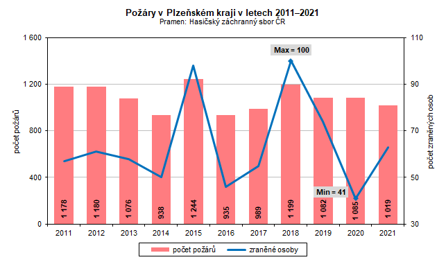 V roce 2021 bylo při požárech v Plzeňském kraji zraněno 63 osob a ve sledovaném období od roku 2011 se jednalo o průměrnou hodnotu počtu zraněných osob v kraji, v meziročním srovnání počet zraněných vzrostl o 53,7 %.