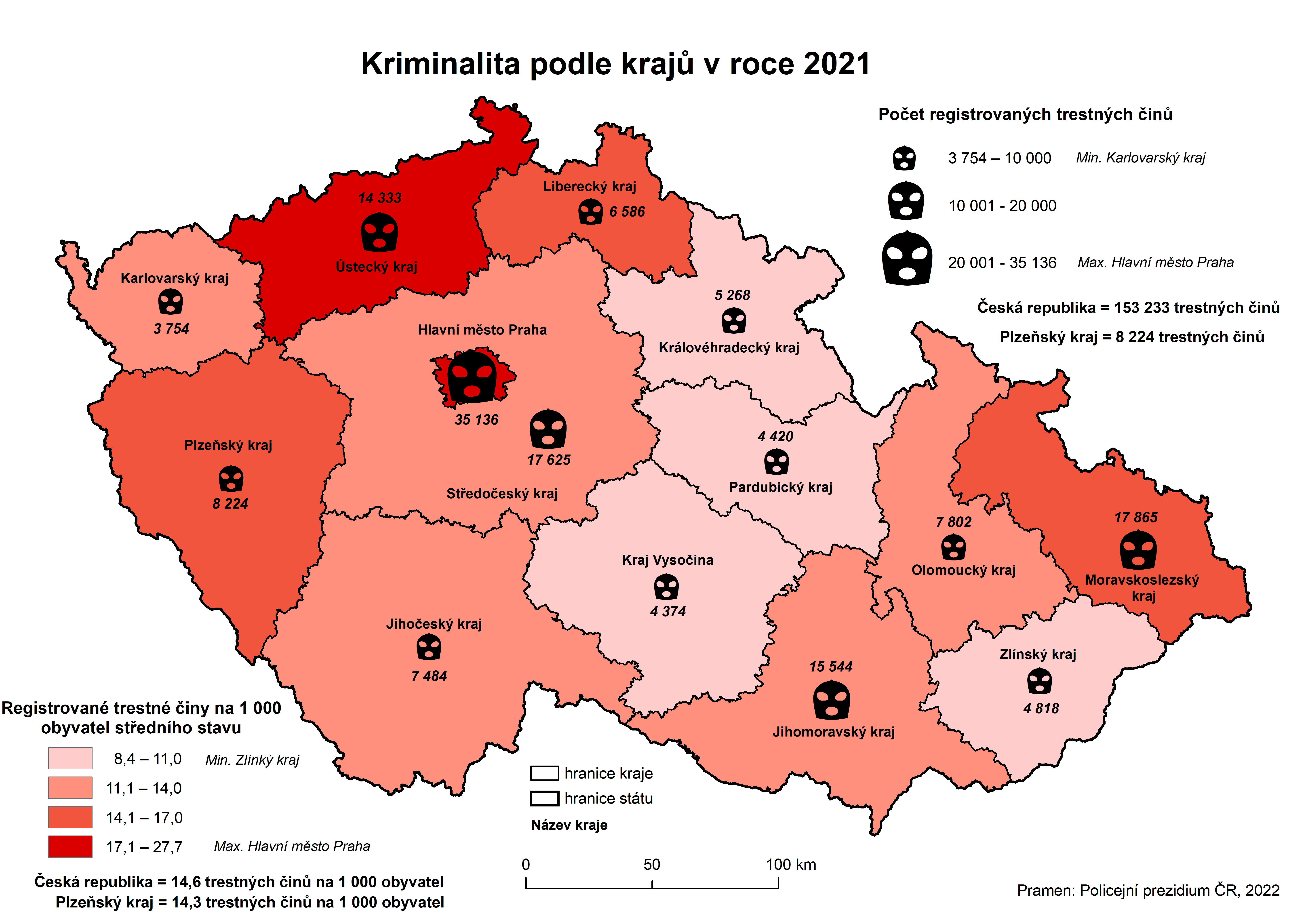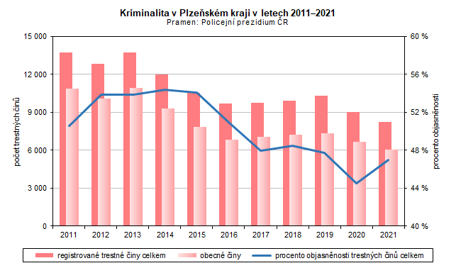 Podle údajů Policejního prezidia ČR bylo v Plzeňském kraji v roce 2021 spácháno 8 224 registrovaných trestných činů, což představuje nejnižší počet trestné činnosti v celé časové řadě od roku 1991. Nejvyšší počet trestné činnosti byl zaznamenán v roce 1999, a to 18 446 registrovaných trestných činů, což byl více než dvojnásobek trestných činů zaznamenaných v roce 2021. Meziročně se snížila trestná činnost o 8,6 %. V celorepublikovém měřítku se Plzeňský kraj podílí 5,4 % na celkové registrované trestné činnosti a řadí se na šesté místo. Na celkové registrované trestné činnosti v ČR se nejvíce podílel kraj Hl. město Praha s téměř 23,0 %, naopak nejmenší podíl byl v Karlovarském kraji (2,4 %).