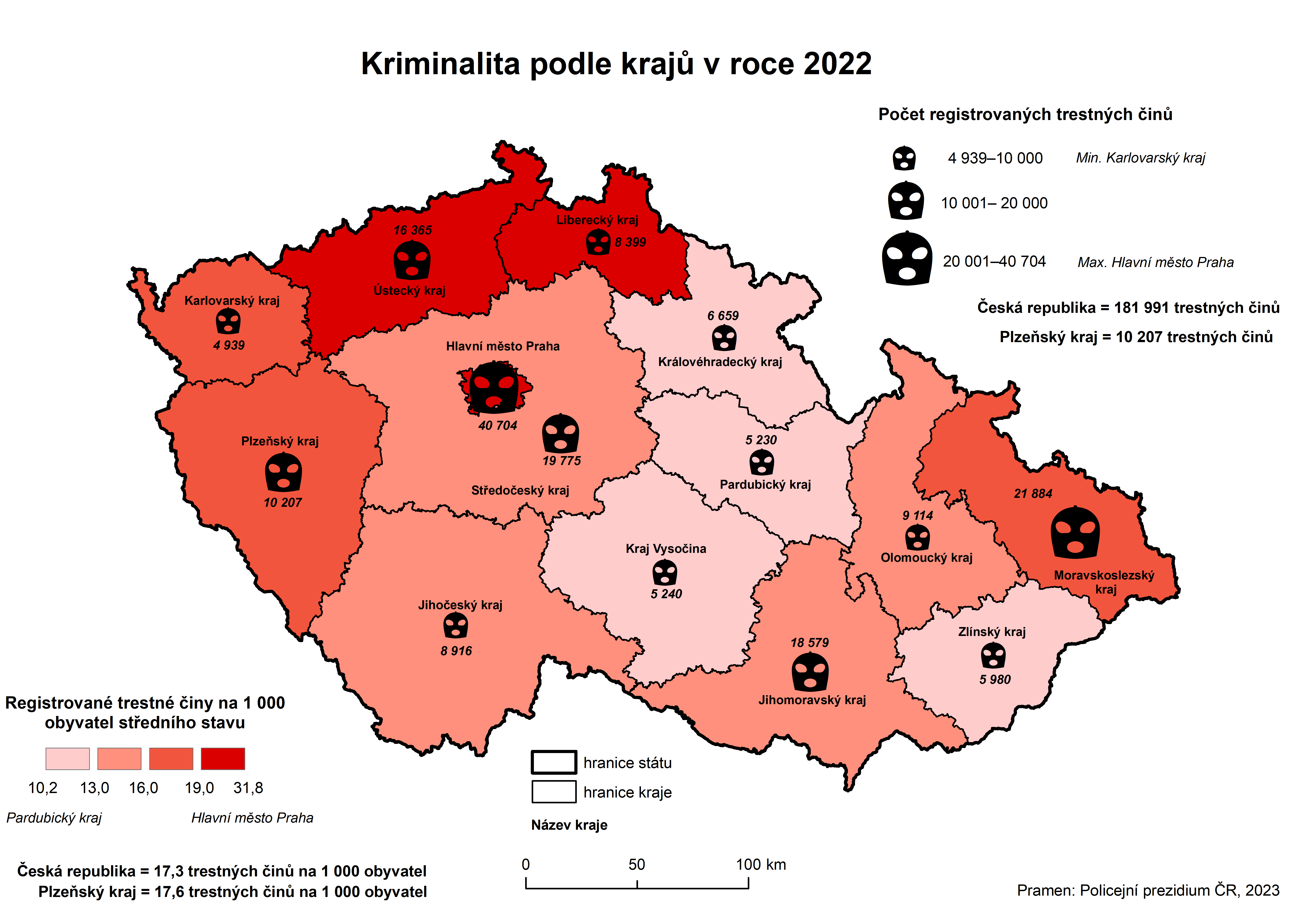 Trestná činnost v přepočtu na tisíc obyvatel středního stavu byla v roce 2022 nejvýraznější v Praze, Ústeckém a Libereckém kraji, naopak nejlépe na tom byly kraje Pardubický, Vysočina a Zlínský. Plzeňský region se zařadil se 17,6 registrovanými trestnými činy na tisíc obyvatel na pátou pozici mezi kraji.