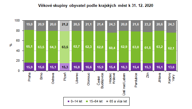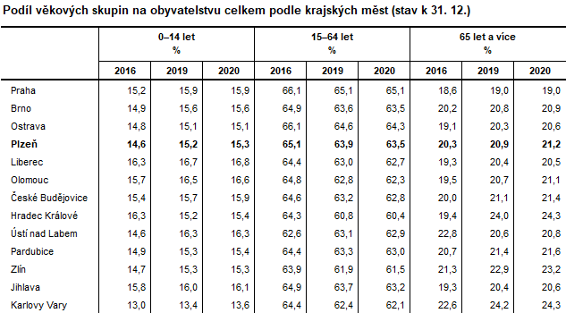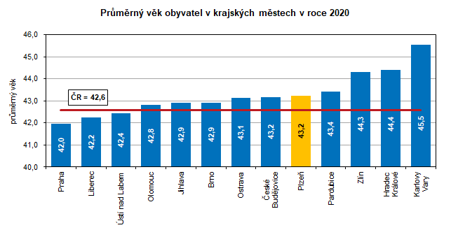Mezi krajská města s nejvyšším průměrným věkem obyvatel patřily Karlovy Vary (45,5 let) a Hradec Králové (44,4 let). V porovnání s průměrným věkem obyvatel v ČR (42,6 let) žili v Karlových Varech obyvatelé starší v průměru téměř o tři roky a v Hradci Králové o dva roky. Naopak nejnižší průměrný věk obyvatel měla Praha (42,0 let) a Liberec (42,2 let). Město Plzeň se řadí ke krajským městům se starší populací. Průměrný věk obyvatel Plzně činil 43,2 let a oproti průměru ČR byl vyšší o 0,6 roku. Plzeň se stala pátým nejstarším krajským městem v ČR.