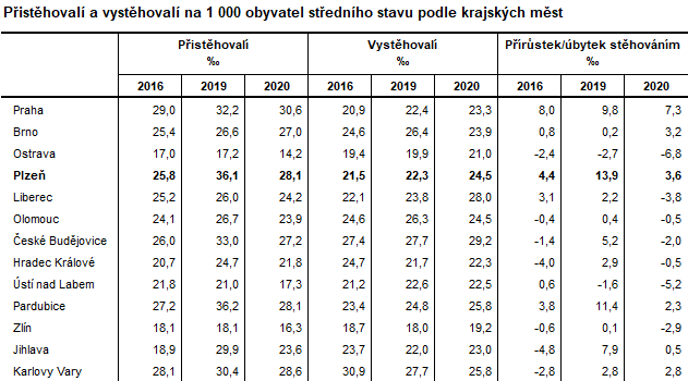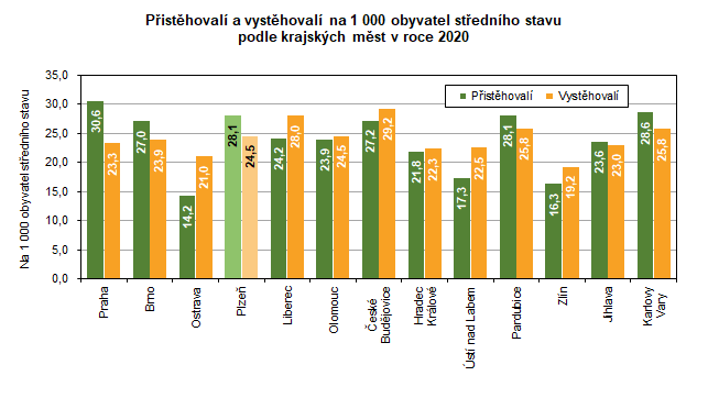 V roce 2020 se nejvíce obyvatel v přepočtu na 1 000 obyvatel středního stavu přistěhovalo do Prahy (30,6) a Karlových Varů (28,6). Nejméně přistěhovalých měla krajská města Ostrava (14,2) a Zlín (16,3). Nejvíce vystěhovalých v roce 2020 připadlo na 1 000 obyvatel středního stavu na krajská města České Budějovice (29,2) a Liberec (28,0). Nejméně vystěhovalých bylo zaznamenáno ve Zlíně (19,2) a Ostravě (21,0).