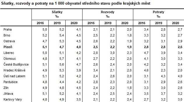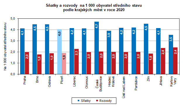 Vyšší sňatečnost a nižší rozvodovost se vyskytuje více na Moravě, kde obyvatelé vyznávají více tradiční hodnoty života a v porovnání se severní částí republiky zde žije více věřících. V roce 2020 byly v krajském městě Plzni uzavřeny v průměru 4 sňatky na 1 000 obyvatel středního stavu (až dvanácté místo mezi ostatními krajskými městy). Rozvodovost patřila k nižším. V roce 2020 byla v průměru v Plzni rozvedena téměř 2 manželství na 1 000 obyvatel středního stavu.