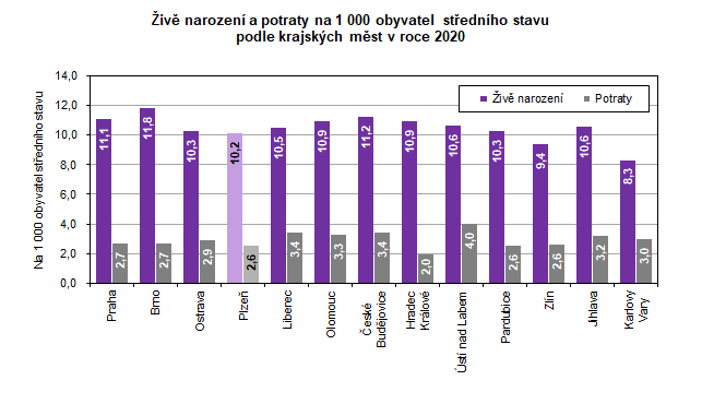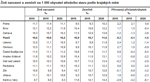 Přirozený přírůstek obyvatel na 1 000 obyvatel středního stavu v roce 2020 byl dosažen v jediném městě, a to v hlavním městě Praze (0,8). V ostatních krajských městech byl naopak zaznamenán přirozený úbytek obyvatel. Nejvyšší přirozené úbytky obyvatel na 1 000 obyvatel středního stavu měla města Karlovy Vary (-6,1), Ostrava (-3,6) a Zlín (-3,2). Ještě v letech 2016 i 2019 se přirozený přírůstek obyvatel vyskytoval i v Brně, Liberci a Olomouci. V roce 2020 zaznamenala tato města přirozené úbytky obyvatel, které souvisely s nižší porodností a vyšší úmrtností. Nižší porodnost a vyšší úmrtnost postihla i ostatní krajská města v důsledku pandemie covid-19.