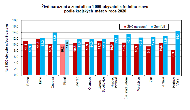 Nejvyšší počet zemřelých na 1 000 obyvatel středního stavu v roce 2020 byl zaznamenán v krajských městech Karlovy Vary (14,4), Ostrava (13,9) a Ústí nad Labem (13,4). V Karlových Varech je vyšší počet zemřelých ovlivněn starší věkovou strukturou (nejstarší krajské město). V Ostravě a Ústí nad Labem hraje hlavní roli kvalita životního prostředí. Dalším faktorem, který se nepříznivě podílel na zvýšené úmrtnosti, byla pandemie covid-19.