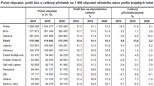 Krajské město Plzeň je podle počtu obyvatel čtvrtým největším městem ČR, k 31. 12. 2020 zde žilo 175 219 obyvatel. Plzeň patří k městům s mírně rostoucím počtem obyvatel, což je mimo jiné ovlivněno větší nabídkou pracovních míst zejména ve zpracovatelském průmyslu. V ČR patří Plzeň mezi čtyři krajská města, která dosáhla v roce 2020 kladného celkového přírůstku obyvatel. Na 1 000 obyvatel středního stavu připadl v Plzni celkový přírůstek 2,2 obyvatel a byl po hlavním městě Praze a Brně třetí nejvyšší. Na celkovém přírůstku obyvatel se podílelo kladné migrační saldo.