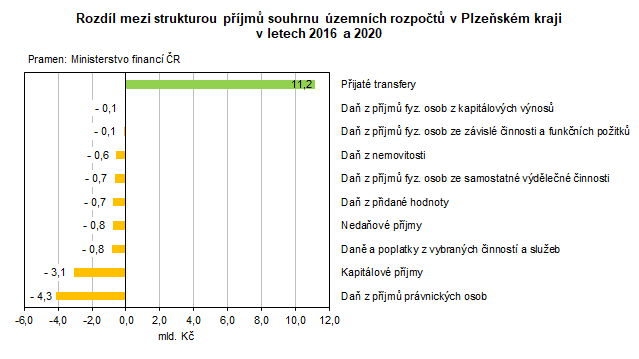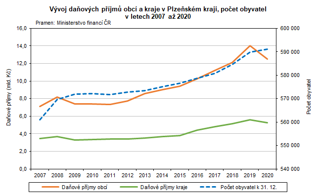 Nejvyšší podíl na daňových příjmech územních rozpočtů představovala daň z přidané hodnoty, která přinesla do územních rozpočtů Plzeňského kraje, obcí a svazků obcí 8,0 mld. Kč. Druhým největším daňovým přispěvatelem byly fyzické osoby, které se podílely téměř 4,5 mld. Kč, přičemž daň z příjmů fyzických osob ze závislé činnosti tvořila většinu těchto příjmů (89,8 %), daň z příjmů fyzických osob z kapitálových výnosů se podílela 8,7 % a daň z příjmů fyzických osob ze samostatné výdělečné činnosti představovala jen 1,5 % těchto příjmů. K poměrně razantnímu poklesu příjmů oproti roku 2016 došlo u daně z příjmů fyzických osob ze samostatné výdělečné činnosti, a to o 69,9 %, způsobené zajisté virem SARS-CoV-2 a s ním spojenými omezeními, během kterých mnoho fyzických osob nemohlo podnikat nebo podnikání v průběhu roku 2020 ukončilo.