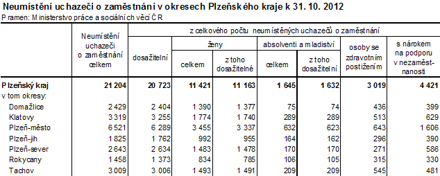 K 31. 10. 2012 bylo na úřadech práce Plzeňského kraje zaregistrováno 21 204 uchazečů o zaměstnání. Z celkového počtu nezaměstnaných uchazečů představovaly ženy 53,9 %. Dosažitelných uchazečů, kteří mohli bezprostředně nastoupit do zaměstnání při nabídce vhodného pracovního místa, bylo evidováno 20 723, tj. 97,7 % z celkového počtu uchazečů. Uchazečů se zdravotním postižením bylo evidováno 3 019, tj. 14,2 % z celkového počtu uchazečů. Nárok na podporu v nezaměstnanosti mělo v kraji 4 421 uchazečů.
