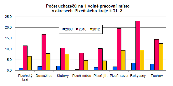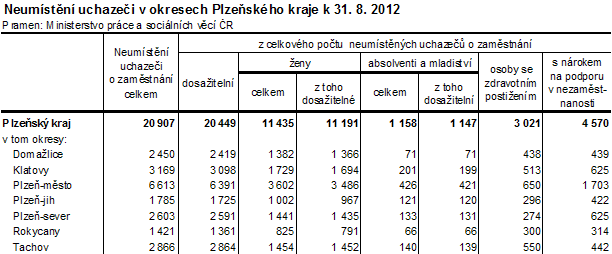 K 31. 8. 2012 bylo na úřadech práce Plzeňského kraje zaregistrováno 20 907 uchazečů o zaměstnání. Z celkového počtu nezaměstnaných uchazečů představovaly ženy 54,7 %. Dosažitelných uchazečů, kteří mohli bezprostředně nastoupit do zaměstnání při nabídce vhodného pracovního místa, bylo evidováno 20 449, tj. 97,8 % z celkového počtu uchazečů. Občanů se zdravotním postižením bylo evidováno 3 021, tj. 14,5 % z celkového počtu uchazečů. Meziročně se počet neumístěných uchazečů snížil o 5,1 % a počet dosažitelných uchazečů o 4,6 %.