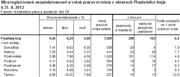 K 31. 8. 2012 dosáhl Plzeňský kraj druhé nejnižší míry registrované nezaměstnanosti v České republice. Míra registrované nezaměstnanosti činila 6,43 % a v porovnání se stejným obdobím loňského roku se snížila o 0,19 procentního bodu. Oproti České republice byla o 1,90 procentního bodu nižší. Tradičně byla nejnižší míra registrované nezaměstnanosti zaznamenána v kraji Hl. m. Praha (4,44 %), naopak nejvyšší v krajích Ústeckém (13,01 %), Moravskoslezském (11,09 %) a Olomouckém (10,12 %).