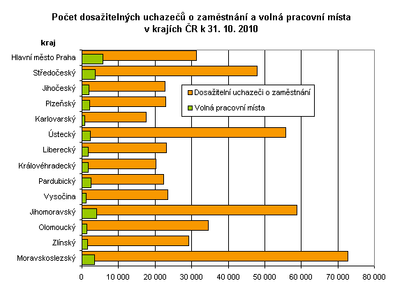 Největší rozdíly mezi počtem dosažitelných uchazečů a počtem volných pracovních míst jsou v Moravskoslezském kraji (69 382), Jihomoravském kraji (54 876) a Ústeckém kraji (53 435). Dokonce i v kraji Hlavní město Praha, kde je situace dlouhodobě nejpříznivější, převyšuje počet registrovaných dosažitelných uchazečů o zaměstnání počet volných pracovních míst o 25 757.