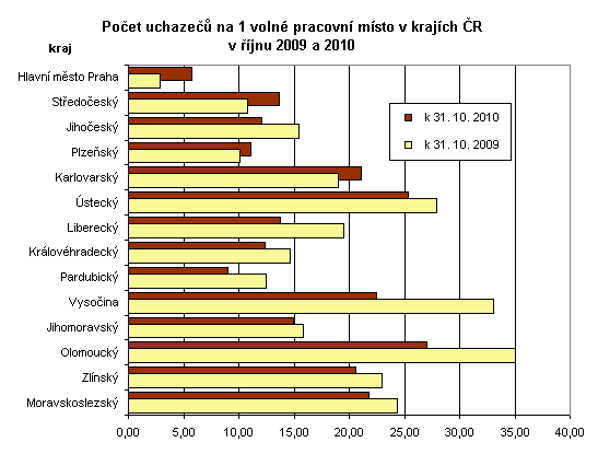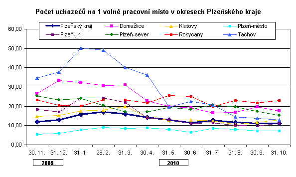 Na jedno volné pracovní místo připadalo v říjnu 2010 v Plzeňském kraji 11,1 uchazečů, celorepublikový průměr činil 14,7 uchazečů. Nejlepší výsledky jsou dlouhodobě dosahovány v kraji Hlavní město Praha, kde na 1 volné pracovní místo připadalo v říjnu 5,7 uchazečů. Naopak nejhůře byl na tom Olomoucký kraj s 27,1 uchazeči na 1 volné pracovní místo.