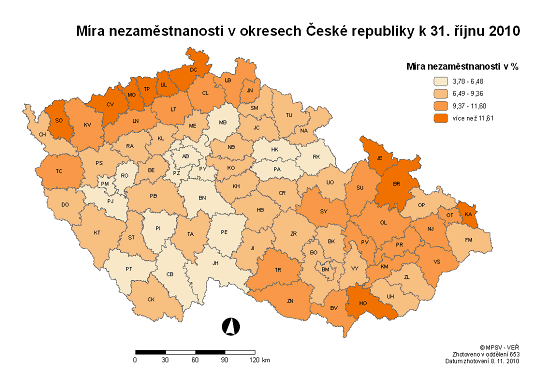 Míru nezaměstnanosti vyšší než republikový průměr vykázalo 46 okresů, nejvyšší byla v okresech Most (15,81%), Bruntál (14,98%), Děčín (14,19%) a Jeseník (14,00%). Nejnižší míra nezaměstnanosti byla zjištěna v okresech Praha-východ (3,78%), Praha (3,98%), Praha-západ (4,03%) a Mladá Boleslav (4,65%).