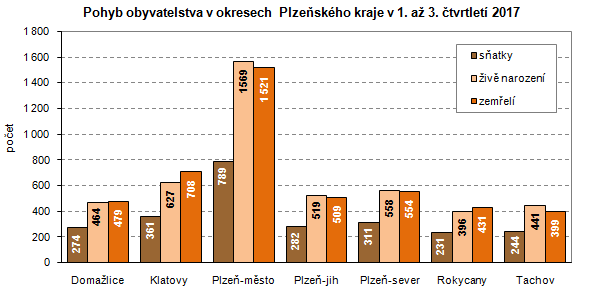 V kraji se za 1. až 3. čtvrtletí 2017 živě narodilo 4 574 dětí, což je o 39 dětí více než za stejné období předchozího roku. Zpravidla se rodí více chlapců než děvčat, tentokrát se to potvrdilo v šesti okresech kraje ze sedmi. Holčičky převažovaly nad chlapci jen v okrese Plzeň-město.