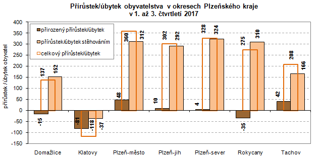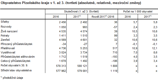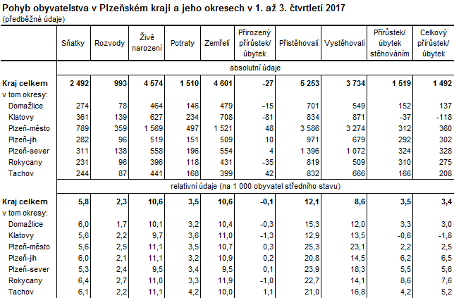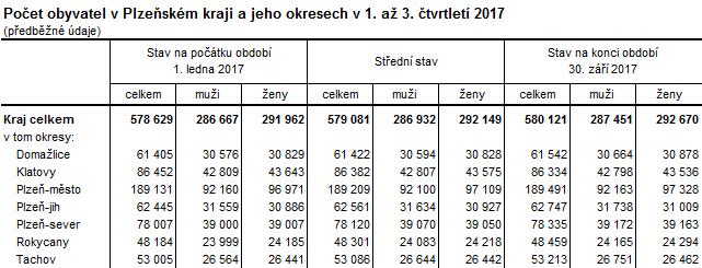 Na základě předběžných výsledků žilo na území Plzeňského kraje k 30. září 2017 celkem 580 121 obyvatel, za devět měsíců tak počet obyvatel vzrostl o 1 492 osob. Nárůst byl způsoben převyšujícím počtem přistěhovalých nad vystěhovalými o 1 519 osob. Tento trend můžeme sledovat v Plzeňském kraji již sedmým rokem. Přestože došlo v Plzeňském kraji k celkovému nárůstu počtu obyvatel, jeden okres v kraji vykazoval pokles, a to okres Klatovy o 118 osob. Nejvíce obyvatel (360) naopak přibylo v okrese Plzeň-město. Počet zemřelých tentokrát převažoval nad počtem živě narozených ve třech okresech ze sedmi (Domažlice, Klatovy a Rokycany) a i v kraji celkem.