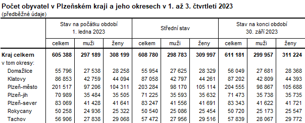Od roku 2022 jsou do celkového počtu obyvatel zahrnuty i osoby, kterým byla udělená dočasná ochrana v souvislosti s válkou na Ukrajině. Na základě předběžných výsledků žilo na území Plzeňského kraje k 30. září 2023 celkem 611 181 obyvatel, za devět měsíců tak počet obyvatel vzrostl o 5 793 osob. Nárůst byl způsoben převyšujícím počtem přistěhovalých nad vystěhovalými (o 6 595 osob). Tento trend můžeme sledovat v regionu již třináctým rokem. V kraji došlo k nárůstu počtu obyvatel celkem ve všech jeho okresech. Nejvíce obyvatel přibylo v okrese Plzeň-město (3 038 osob), výrazný přírůstek obyvatel byl zaznamenán i na Tachovsku (933 osob). Počet zemřelých převažoval nad počtem živě narozených v kraji i ve všech jeho okresech.