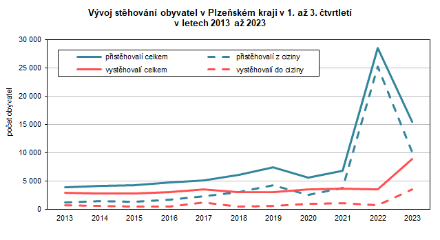 Do Plzeňského kraje se za devět měsíců od počátku roku 2023 přistěhovalo 15 470 osob, což bylo o 13 006 osob méně než v předchozím roce. Z ostatních krajů v ČR se přistěhovalo 5 318 osob a 10 152 osob ze zahraničí. Za stejné období se z kraje vystěhovalo 8 875 osob (meziročně o 5 347 více), z toho 59,5 % do ostatních krajů ČR a 40,5 % do zahraničí. Opět je třeba zmínit, že do počtu obyvatel jsou zahrnuty osoby s udělenou dočasnou ochranou v České republice.