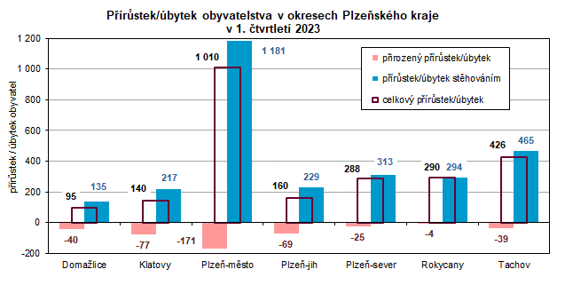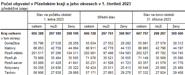 Od roku 2022 jsou do celkového počtu obyvatel zahrnuty i osoby, kterým byla udělena dočasná ochrana v souvislosti s válkou na Ukrajině. Na základě předběžných výsledků žilo na území Plzeňského kraje k 31. březnu 2023 celkem 607 797 obyvatel, za tři měsíce tak počet obyvatel vzrostl o 2 409 osob. Nárůst byl způsoben převyšujícím počtem přistěhovalých nad vystěhovalými (o 2 834 osob). Tento trend můžeme sledovat v Plzeňském kraji již třináctým rokem. V regionu došlo k nárůstu celkového počtu obyvatel ve všech okresech, nejvíce obyvatel přibylo v okrese Plzeň-město (1 010 osob), nejméně pak na Domažlicku (95 osob). Počet zemřelých převažoval nad počtem živě narozených jak v celém kraji, tak i ve všech jeho okresech, nejvíce v okrese Plzeň-město (o 171 osob), na Klatovsku (o 77 osob) a v okrese Plzeň-jih (o 69 osob).