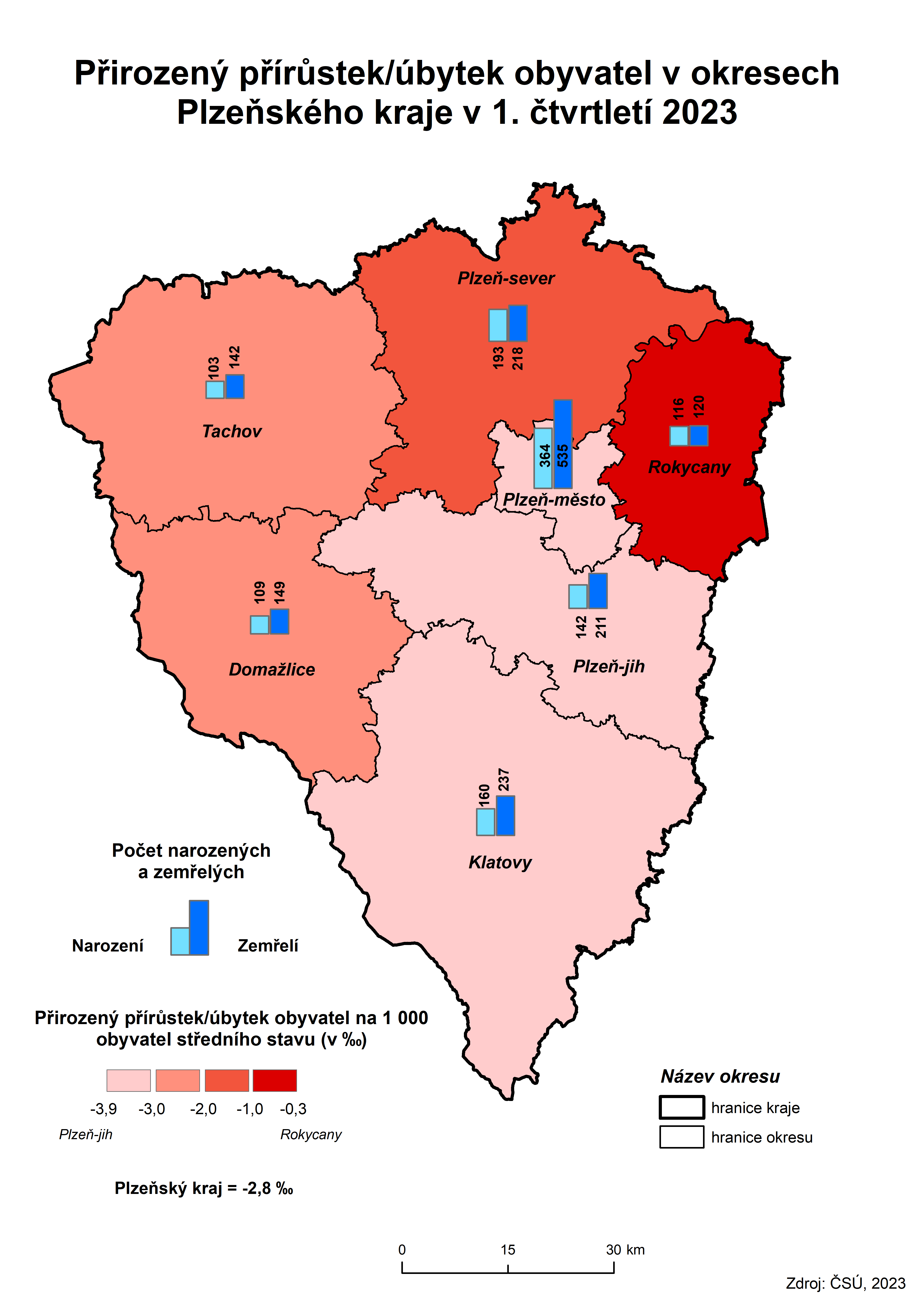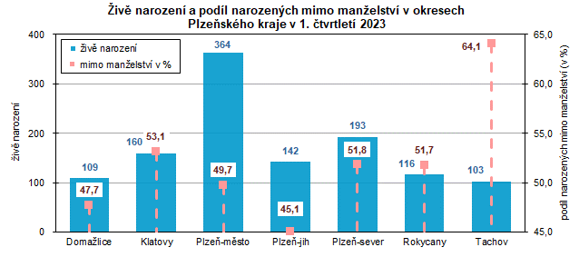 V kraji se za 1. čtvrtletí 2023 živě narodilo 1 187 dětí, což je o 178 dětí méně než za stejné období předchozího roku. V kraji se narodilo více chlapců než děvčat, a to o 57. V tomto čtvrtletí převažovaly holčičky nad chlapci v okresech Domažlice (o 7) a Klatovy (o 2).