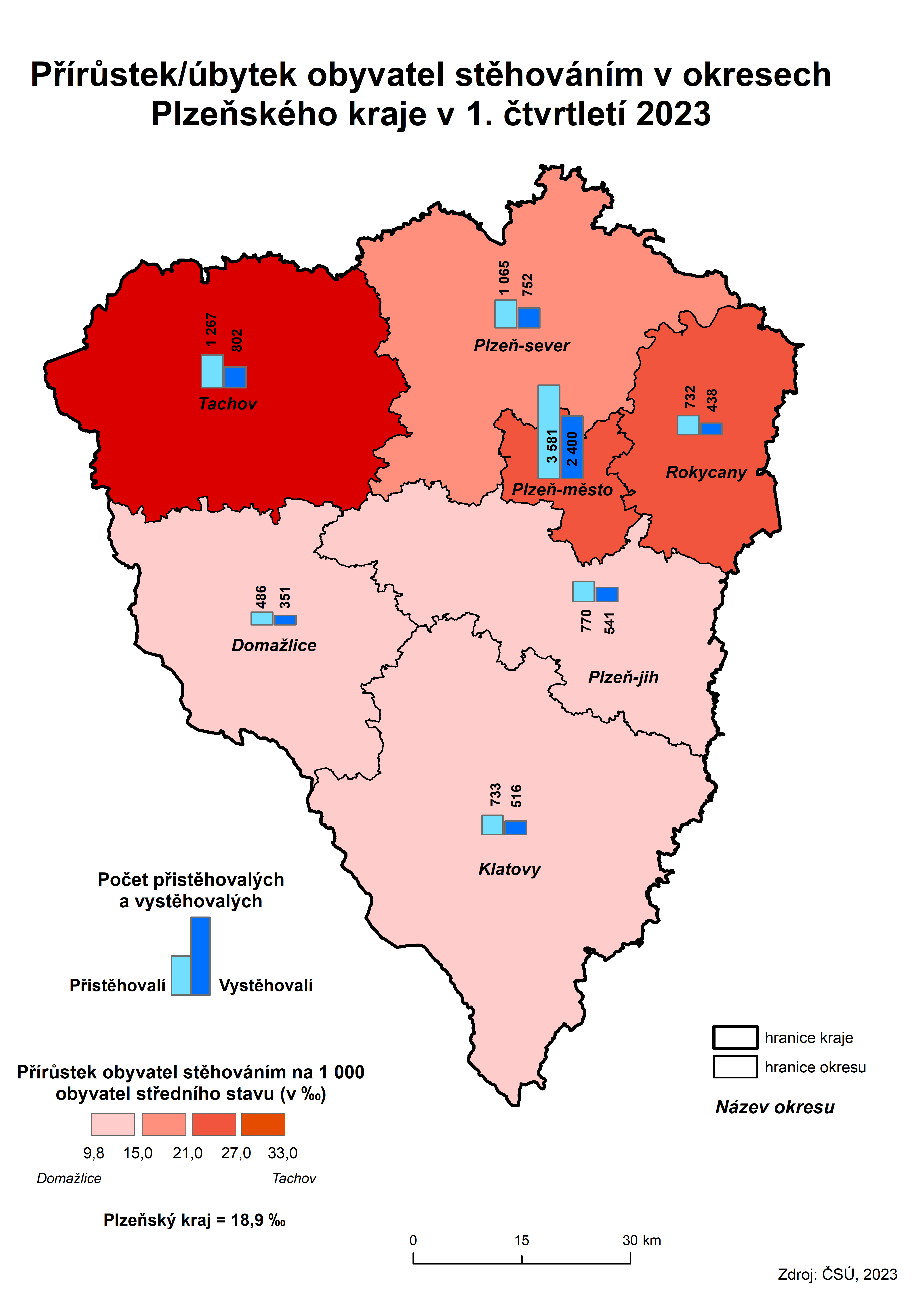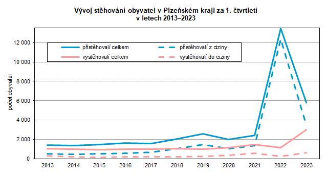 Do Plzeňského kraje se za tři měsíce od počátku roku 2023 přistěhovalo 5 819 osob, což bylo o 7 636 osob méně než v předchozím roce. Z ostatních krajů v ČR se přistěhovalo 2 349 osob a 3 470 osob ze zahraničí. Za stejné období se z kraje vystěhovalo 2 985 osob (meziročně o 1 818 více), z toho 80,0 % do ostatních krajů v ČR a pětina do zahraničí. Opět je ale třeba upozornit, že do počtu obyvatel jsou zahrnuti i uprchlíci z Ukrajiny s udělenou dočasnou ochranou v České republice.