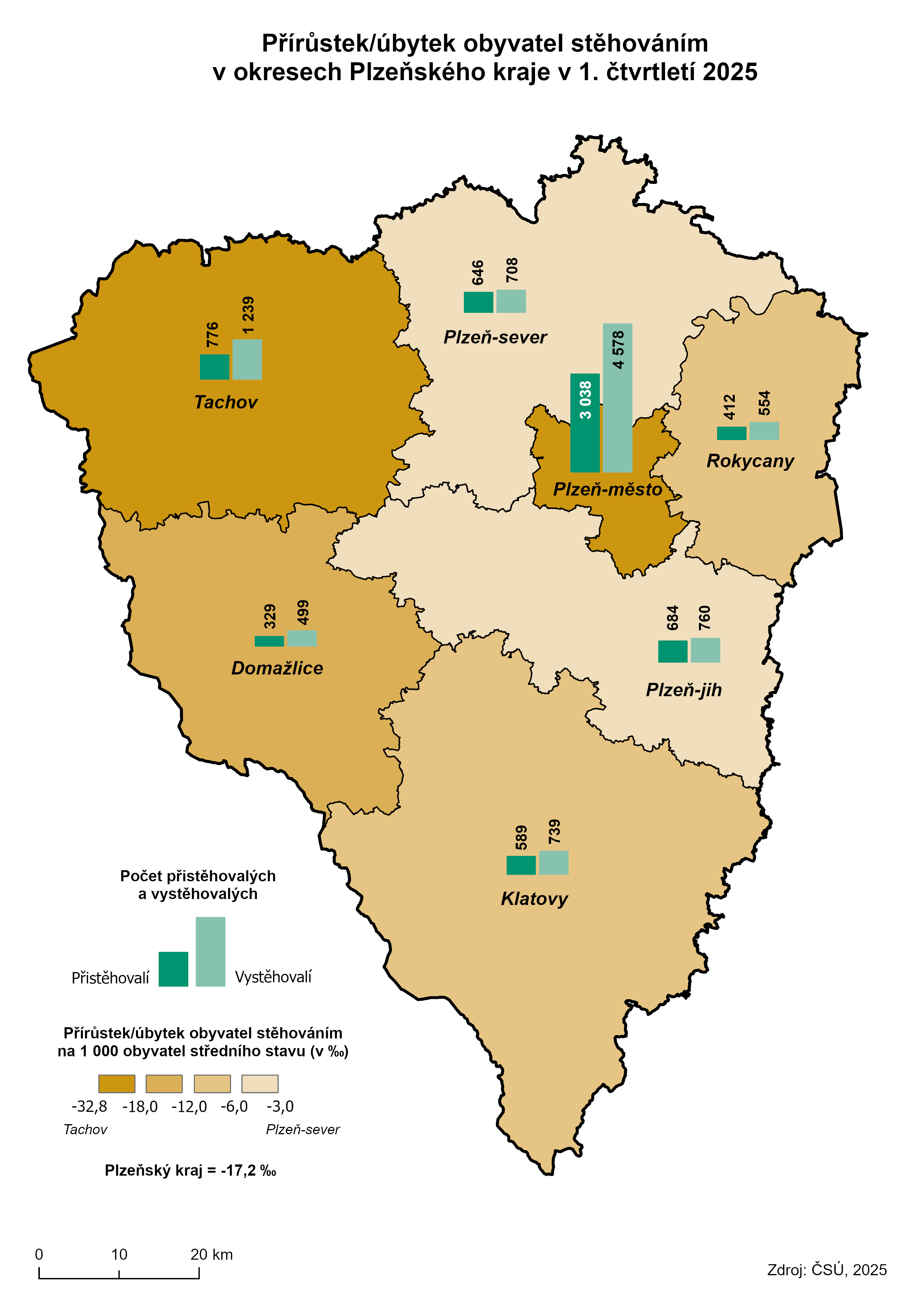 Do Plzeňského kraje se za tři měsíce od počátku roku 2025 přistěhovalo 3 824 osob, což bylo o 265 osob méně než v předchozím roce. Z ostatních krajů Česka se přistěhovalo 1 693 osob a 2 131 osob ze zahraničí. Za stejné období se z kraje vystěhovalo 6 427 osob (meziročně o 470 méně), z toho 26,7 % do ostatních krajů v Česku a 4 711 osob do zahraničí. Opět je ale třeba upozornit, že velkou část vystěhovalých představovaly osoby, kterým na konci března 2025 skončila platnost udělené mezinárodní ochrany, a nepožádaly o její prodloužení.
