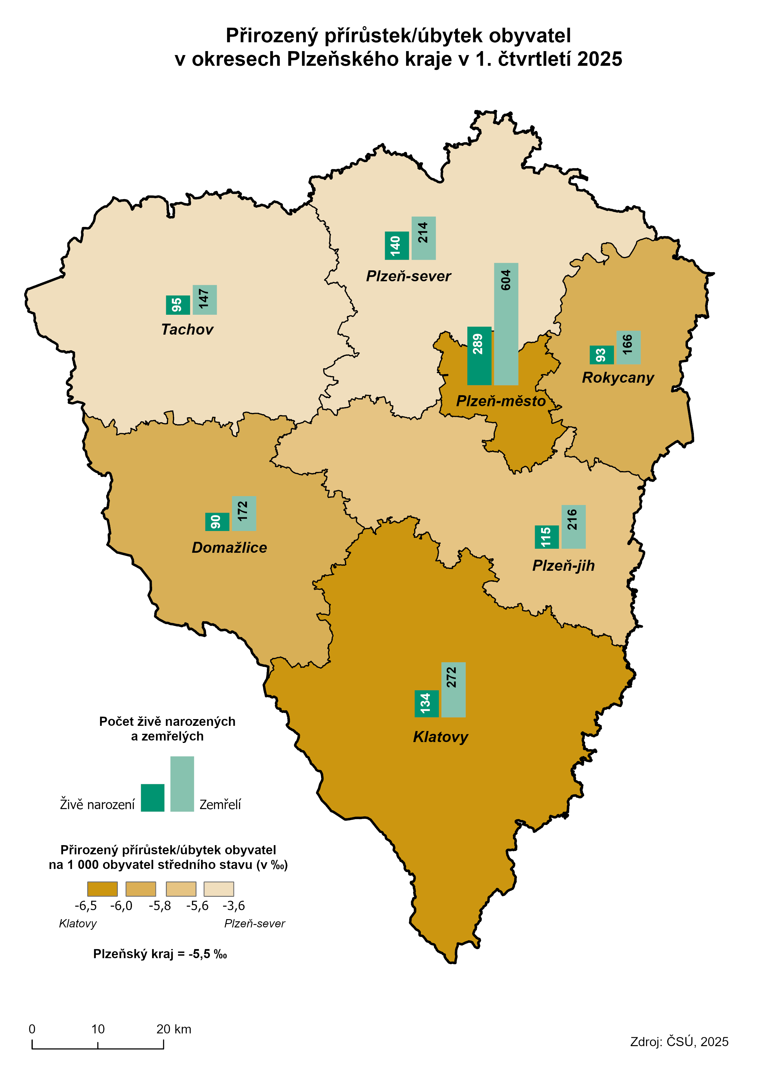 V regionu se za 1. čtvrtletí 2025 živě narodilo 956 dětí, což je o 188 dětí méně než za stejné období předchozího roku. V kraji se narodilo více chlapců než děvčat, a to o 26. V tomto čtvrtletí převažovaly mírně holčičky nad chlapci v okresech Klatovy (o 8), Tachov (o 5) a Plzeň-město (o 1).