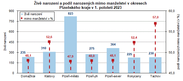 V kraji se za 1. pololetí 2023 živě narodilo 2 462 dětí, což je meziročně o 293 dětí méně. Narodilo se zde více chlapců než děvčat. Holčičky převažovaly nad chlapci pouze v okrese Plzeň-jih (o 29).