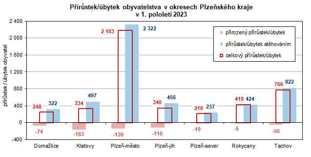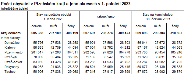Od roku 2022 jsou do celkového počtu obyvatel zahrnuty i osoby, kterým byla udělená dočasná ochrana v souvislosti s válkou na Ukrajině. Na základě předběžných výsledků žilo na území Plzeňského kraje k 30. červnu 2023 celkem 609 896 obyvatel, za šest měsíců tak počet obyvatel vzrostl o 4 508 osob. Nárůst byl způsoben převyšujícím počtem přistěhovalých nad vystěhovalými (o 5 080 osob). Tento trend můžeme sledovat v Plzeňském kraji již třináctým rokem. V regionu došlo k nárůstu počtu obyvatel ve všech jeho okresech. Nejvíce obyvatel přibylo v okrese Plzeň-město (2 183 osob), výrazný přírůstek obyvatel byl zaznamenán také na Tachovsku (766 osob). Počet zemřelých převažoval nad počtem živě narozených jak v celém kraji, tak i ve všech jeho okresech, nejvíce na Klatovsku (o 163 osob), dále pak v okresech Plzeň-město (o 139 osob) a Plzeň-jih (o 116 osob).