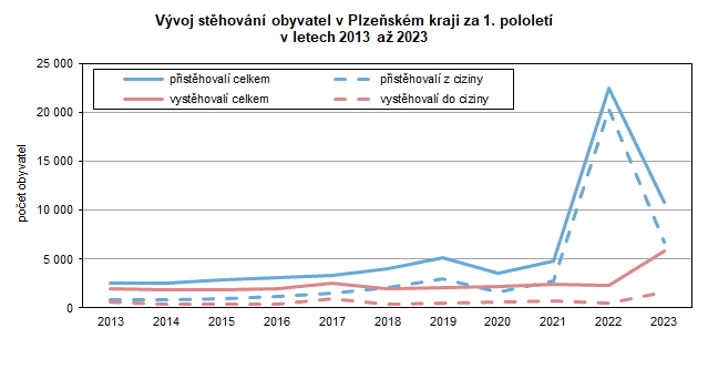 Do Plzeňského kraje se za půl roku od počátku roku 2023 přistěhovalo 10 857 osob, což bylo o 11 630 osob méně než v předchozím roce. Z ostatních krajů v ČR se přistěhovalo 4 084 osob a 6 773 osob ze zahraničí. Za stejné období se z kraje vystěhovalo 5 777 osob (meziročně o 3 484 více), z toho 72,6 % do ostatních krajů v ČR a 27,4 % do zahraničí. Opět je třeba zmínit, že do počtu obyvatel jsou zahrnuti uprchlíci z Ukrajiny s udělenou dočasnou ochranou v České republice.