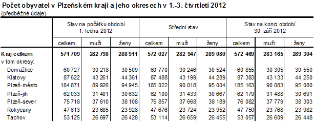 K 30. 9. 2012 žilo na území Plzeňského kraje 289 304 žen, tj. 50,5 %. V porovnání se stavem na počátku roku 2012 se snížil počet obyvatel v okrese Klatovy o 239 a Tachov o 68 osob. Snížený počet obyvatel v okrese Klatovy byl ovlivněn záporným přirozeným i migračním saldem. V okrese Tachov pouze saldem migračním. V ostatních okresech kraje se počet obyvatel zvýšil, nejvíce obyvatel přibylo v okresech Plzeň-sever (o 364 osob) a Plzeň-město (o 292 osob). Na rostoucím počtu obyvatel se ve všech pěti okresech podílel převažující počet přistěhovalých nad vystěhovalými. Přirozený přírůstek vykázaly pouze dva okresy, a to Tachov (o 56 osob) a Plzeň-město (pouze o 1 osobu).