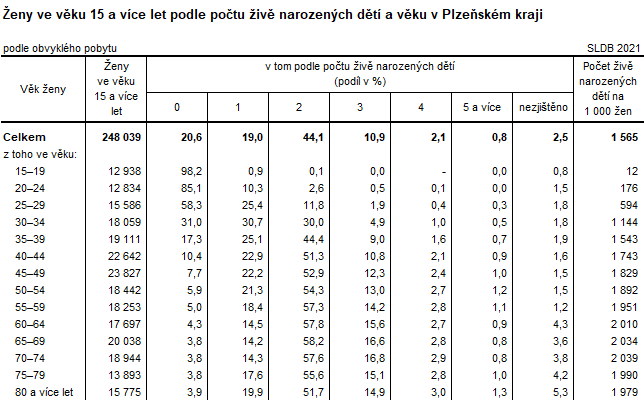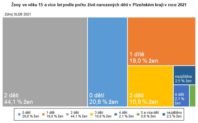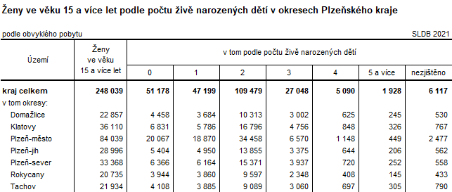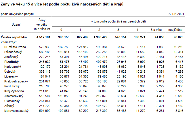 ČSÚ zveřejnil v květnu letošního roku údaje o počtu živě narozených dětí na základě výsledků Sčítání 2021. Informace o tom, kolik dětí se ženám v České republice v průběhu života živě narodilo až do rozhodného okamžiku z 26. na 27. března 2021, byly zjišťovány u všech žen ve věku 15 a více let. Ve všech krajích České republiky měly ženy nejčastěji dvě děti. Skupinu s druhým nejvyšším zastoupením mezi ženami 15letými a staršími představovaly ženy bezdětné, a to v jedenácti krajích ČR včetně Plzeňského kraje.