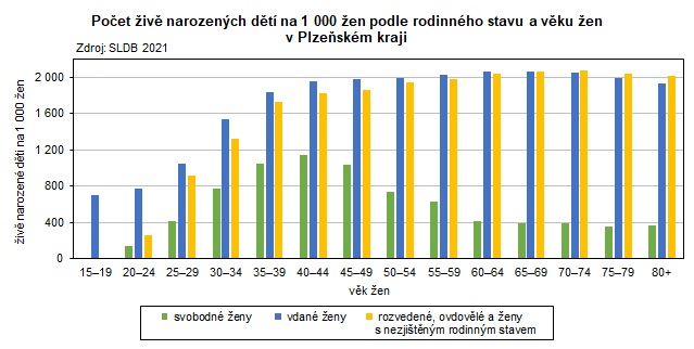 Oproti tomu byl téměř 1 milion žen v České republice bezdětných. V Plzeňském kraji jich žilo v roce 2021 celkem 51 178 a jejich podíl dosáhl 20,6 % všech žen v plodném věku. V porovnání s rokem 2011 se jejich zastoupení v kraji zvýšilo o 542 žen (tj. o 0,3 p. b.). V mezikrajském porovnání byl podíl bezdětných žen v Plzeňském kraji čtvrtý nejvyšší. Před ním se v počtu bezdětných žen umístil kraj Hl. město Praha (32,0 %), Jihomoravský kraj (23,3 %) a Olomoucký kraj (20,7 %). Naopak nejnižší podíl bezdětných žen byl evidován v Karlovarském kraji, a to 19,3 %. Bezdětné ženy představovaly druhé nejvyšší zastoupení mezi ženami 15 let a více celkem v jedenácti krajích České republiky. Výjimku tvořily pouze kraje Karlovarský a Ústecký, kde obsadily druhou příčku ženy s jedním dítětem a kraj Vysočina, kde to byly ženy se třemi a více dětmi.